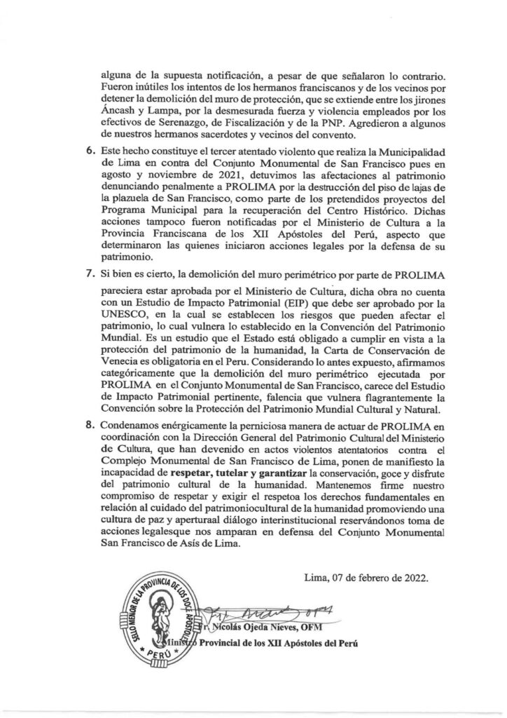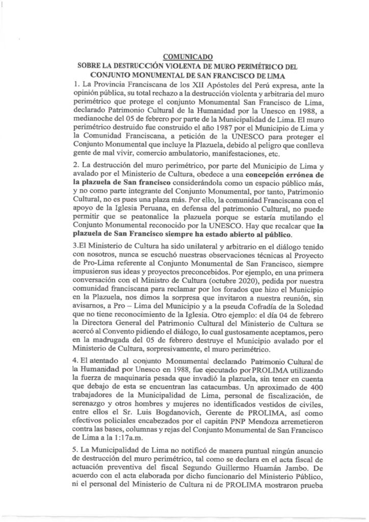 COMUNICADO DE LA PROV. DE LOS XII APÓSTOLES DEL PERÚ SOBRE DESTRUCCIÓN DEL MURO PERIMÉTRICO febrero 7, 2022 FacebookTwitterWhatsApp COMUNICADO PROV XII APOST (1)Descarga VER PDF