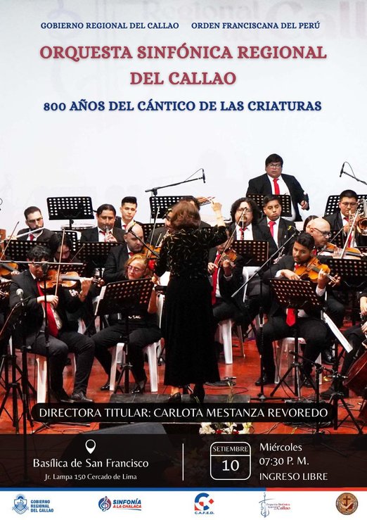 La Orquesta Sinfónica del Callao, bajo la dirección de la maestra Carlota Mestanza Revoredo, ofrecerá un concierto este miércoles 10 de septiembre a las 7 pm en la Basílica de San Francisco de Lima en el marco de los 800 años del «Cántico de las criaturas» de San Francisco de Asís.